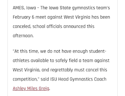[ https://www.sportingnews.com/ca/tsn/news/why-iowa-state-made-shocking-decision-cancel-womens-gymnastics-season/d34dbbfad3c9424bdf51bc49 ]
