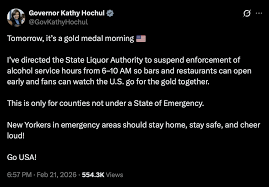 Albany, NY - February 22nd, 2026 - In a move that has sparked both enthusiasm and debate, New York Governor Kathy Hochul has issued a temporary suspension of key state liquor laws, allowing bars and restaurants to open significantly earlier than usual this Sunday. The decision, announced Saturday evening, is directly tied to the highly anticipated Olympic hockey showdown between the United States and Canada. The game, a perennial rivalry, is expected to draw massive crowds to viewing establishments across the state, potentially exacerbating existing challenges posed by a severe blizzard warning currently in effect for several regions.